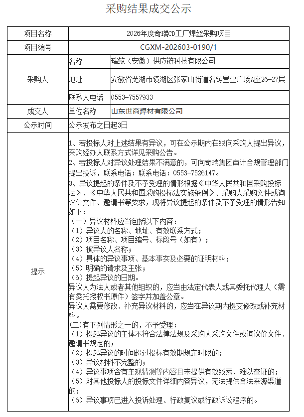 Shandong Szeshang Welding Materials Co., Ltd. è orgogliosa di annunciare di essersi aggiudicata il contratto di fornitura ufficiale per il progetto di approvvigionamento di fili per saldatura della fabbrica Chery CD 2026 (progetto n.: CGXM-202603-0190/1).