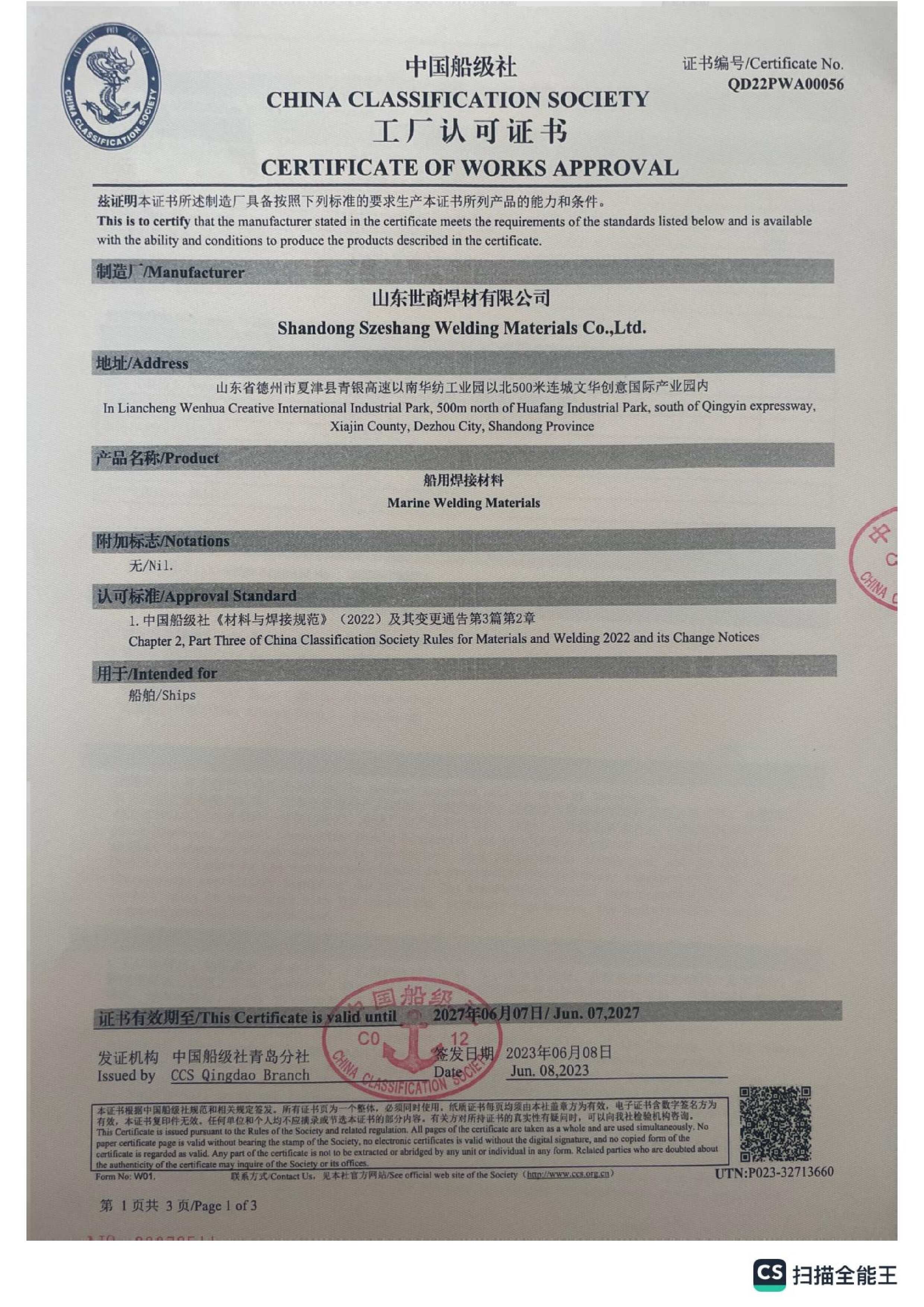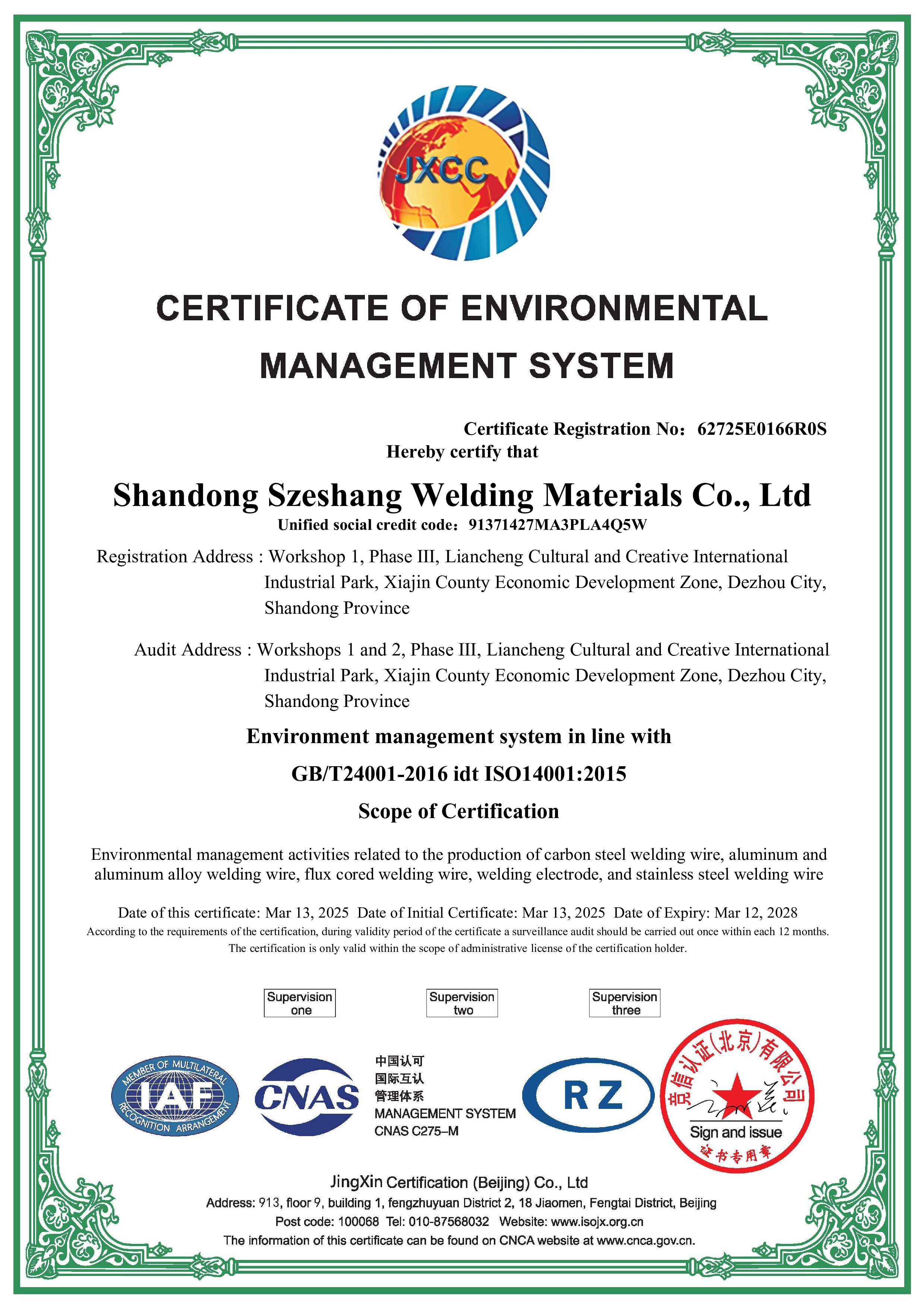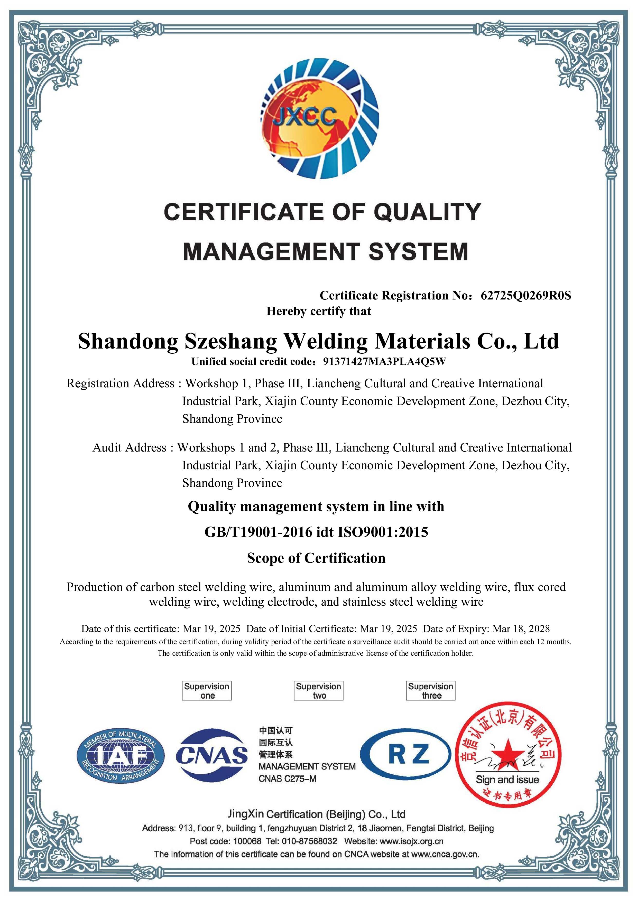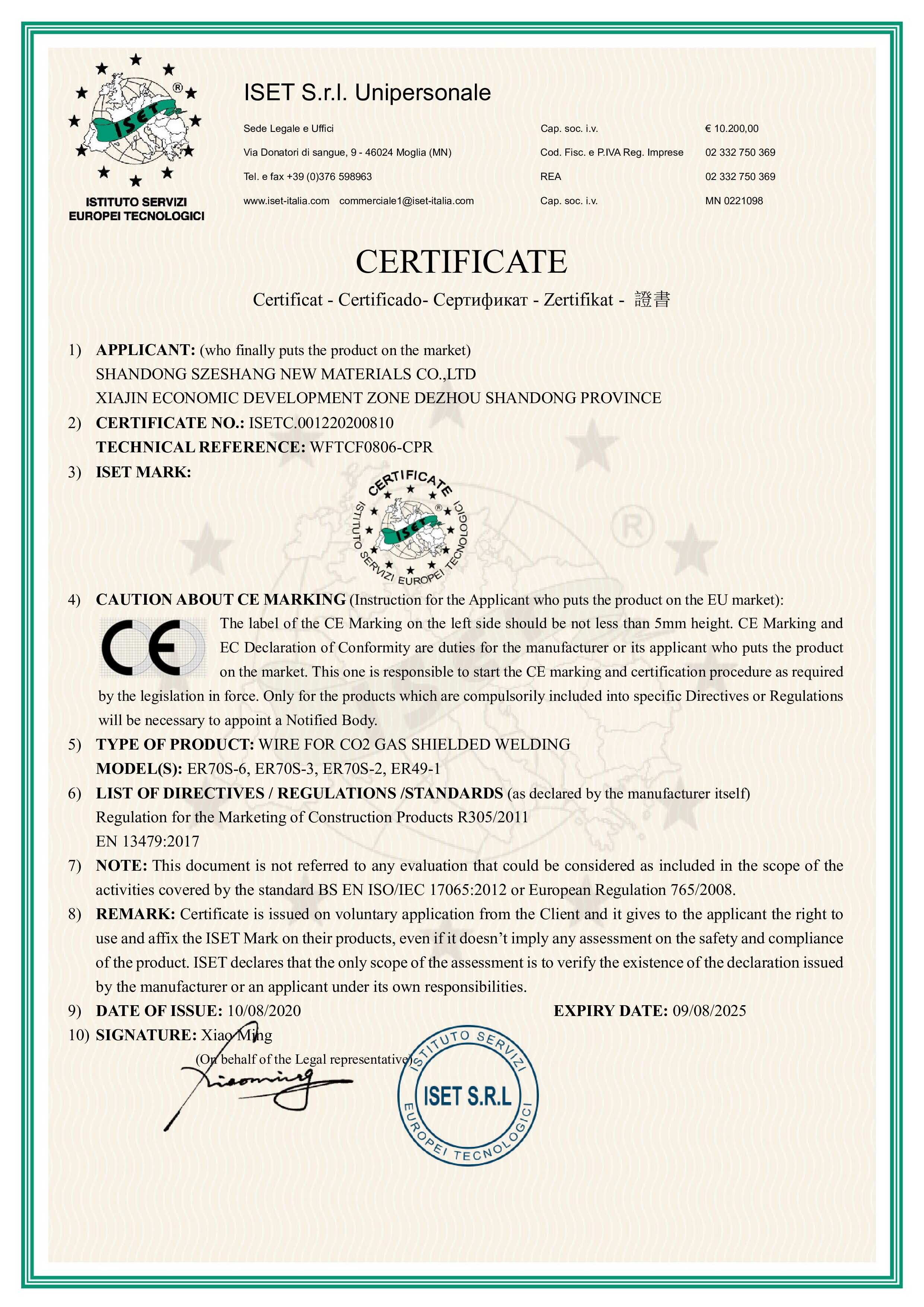 Certification for Szeshang Brand Welding wire and welding electrode