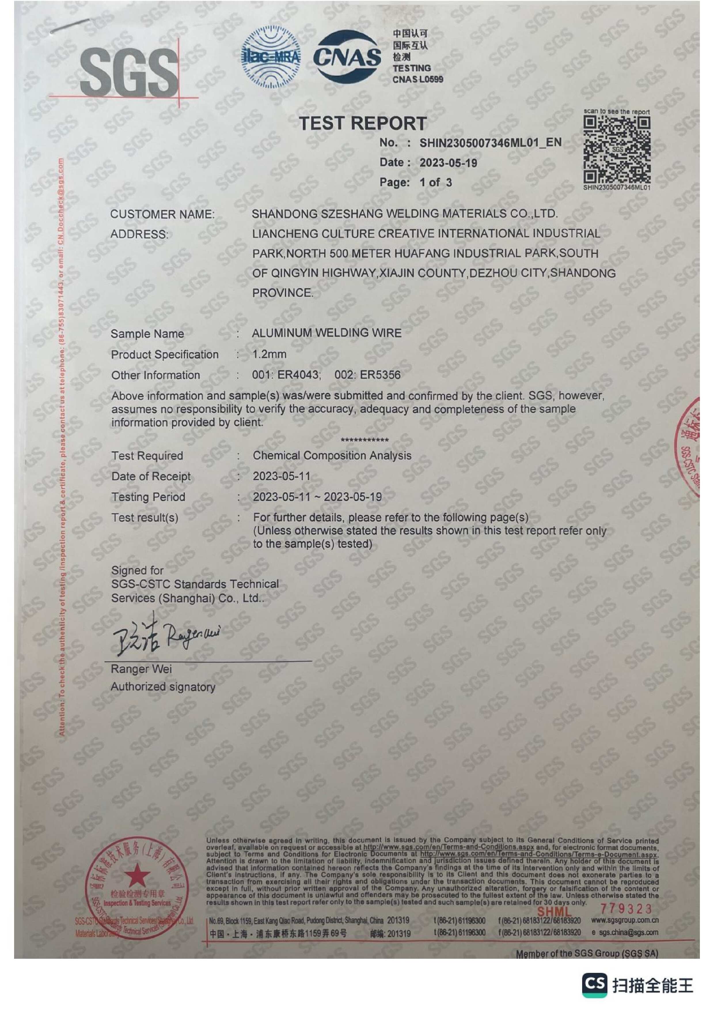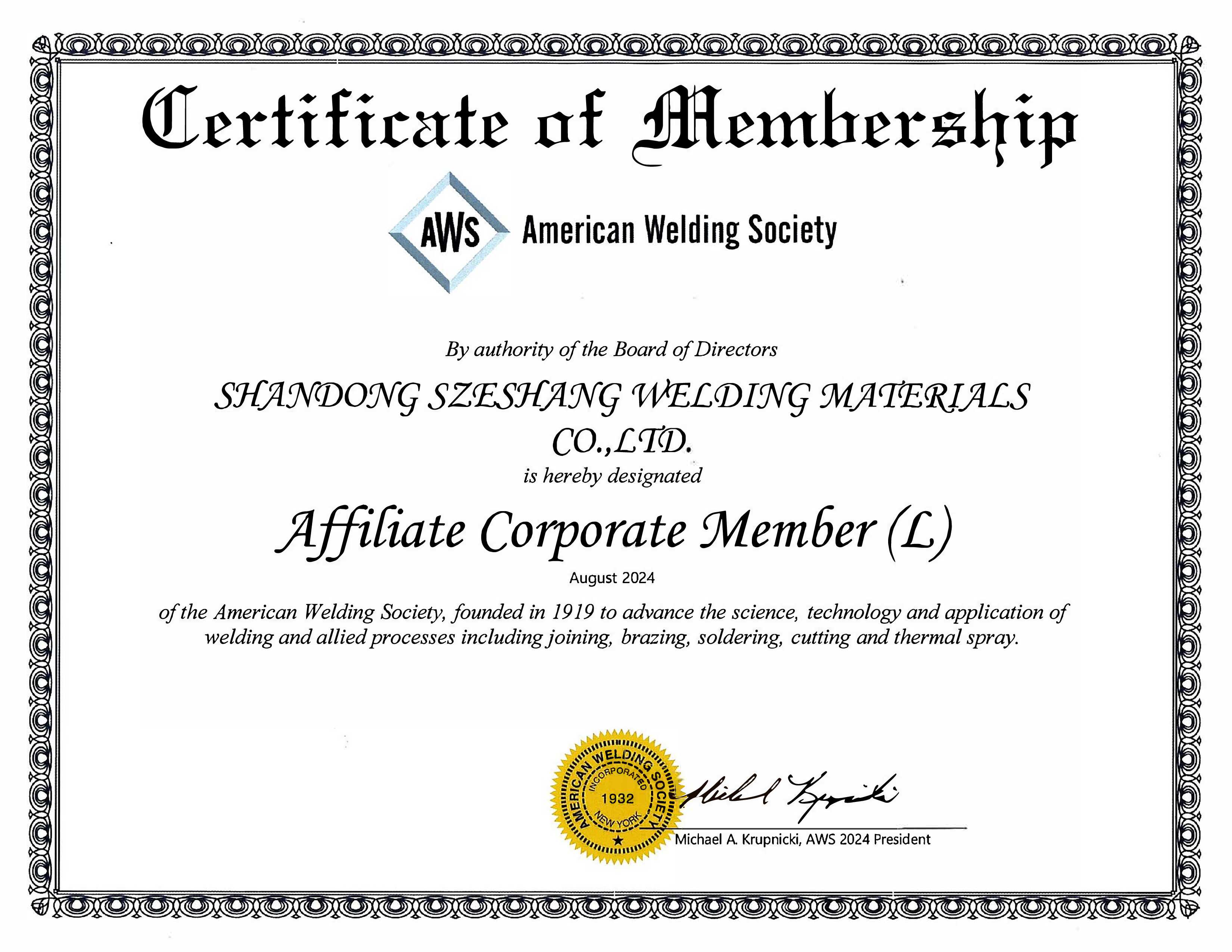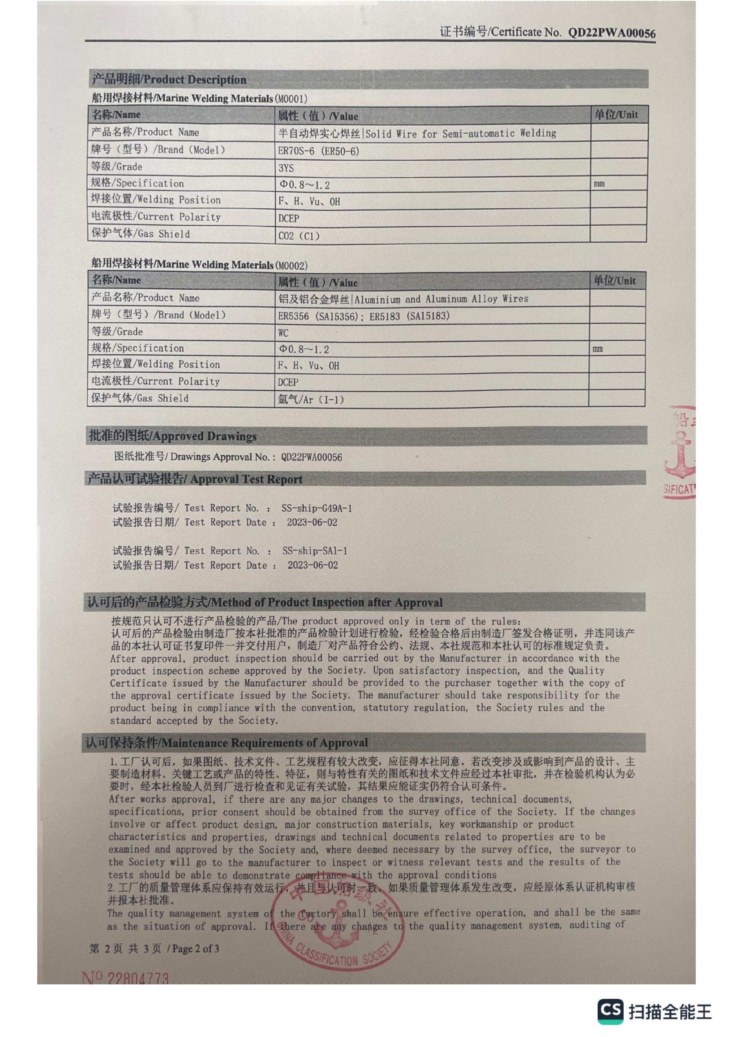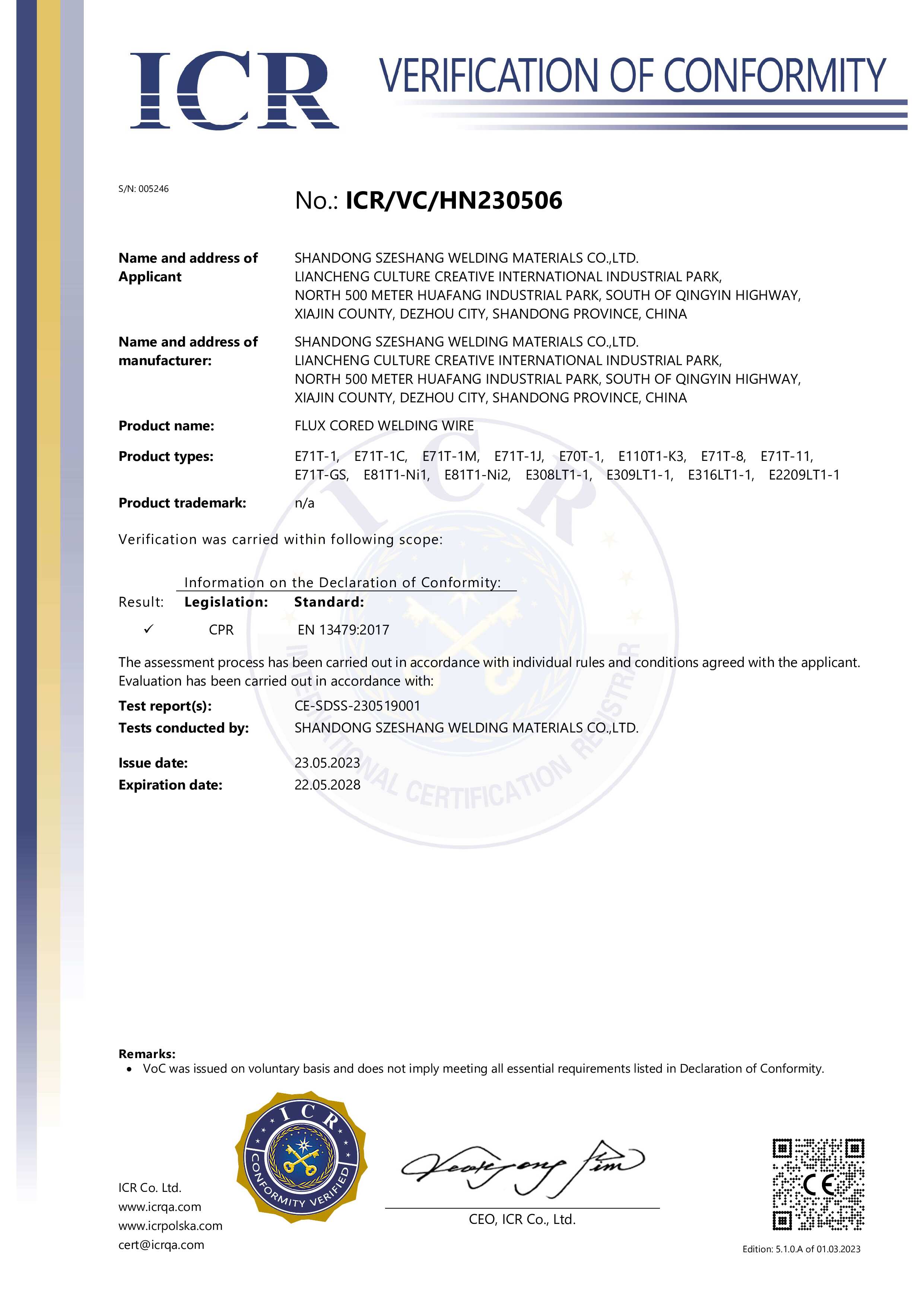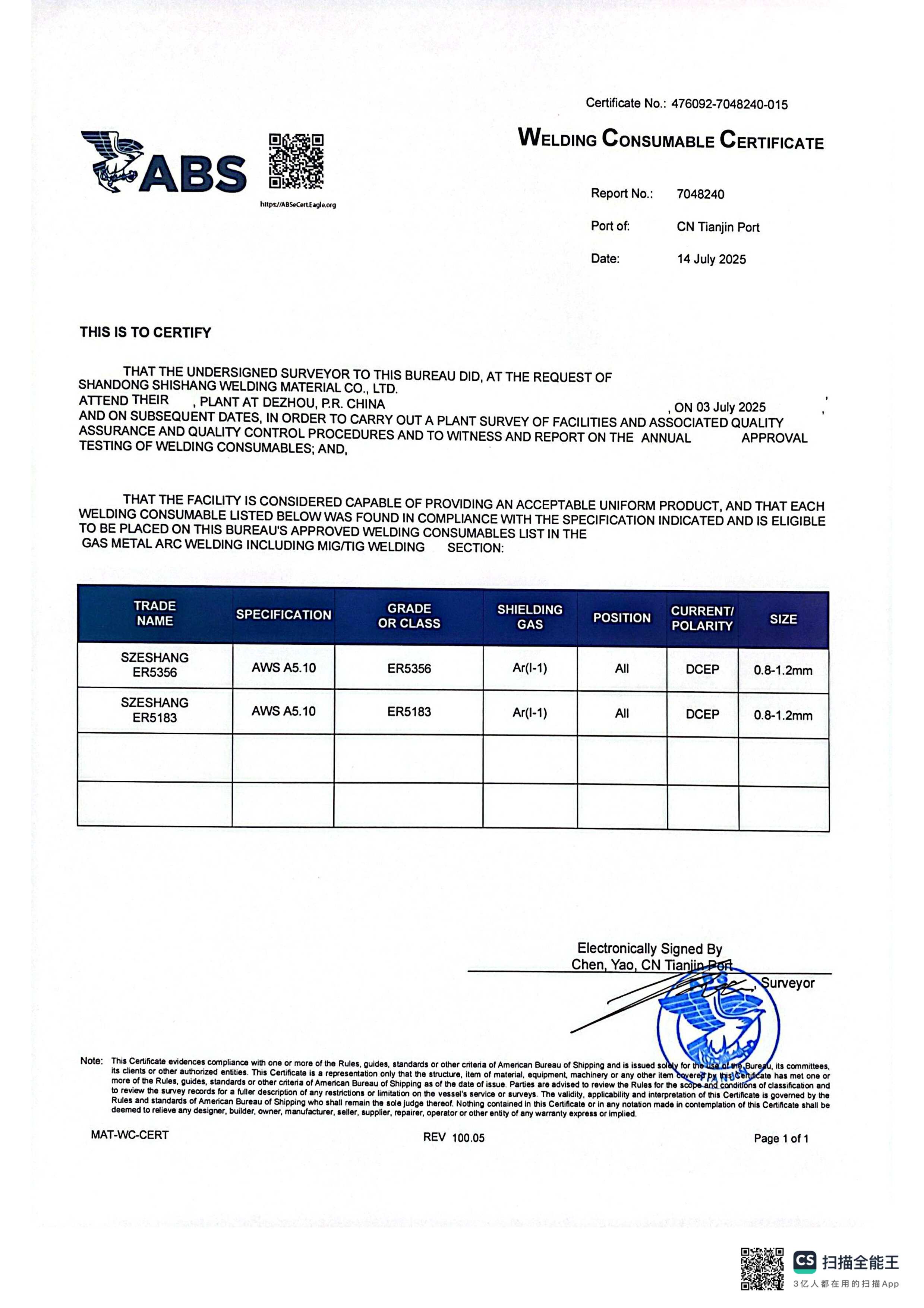 Certification for Szeshang Brand Welding wire and welding electrode