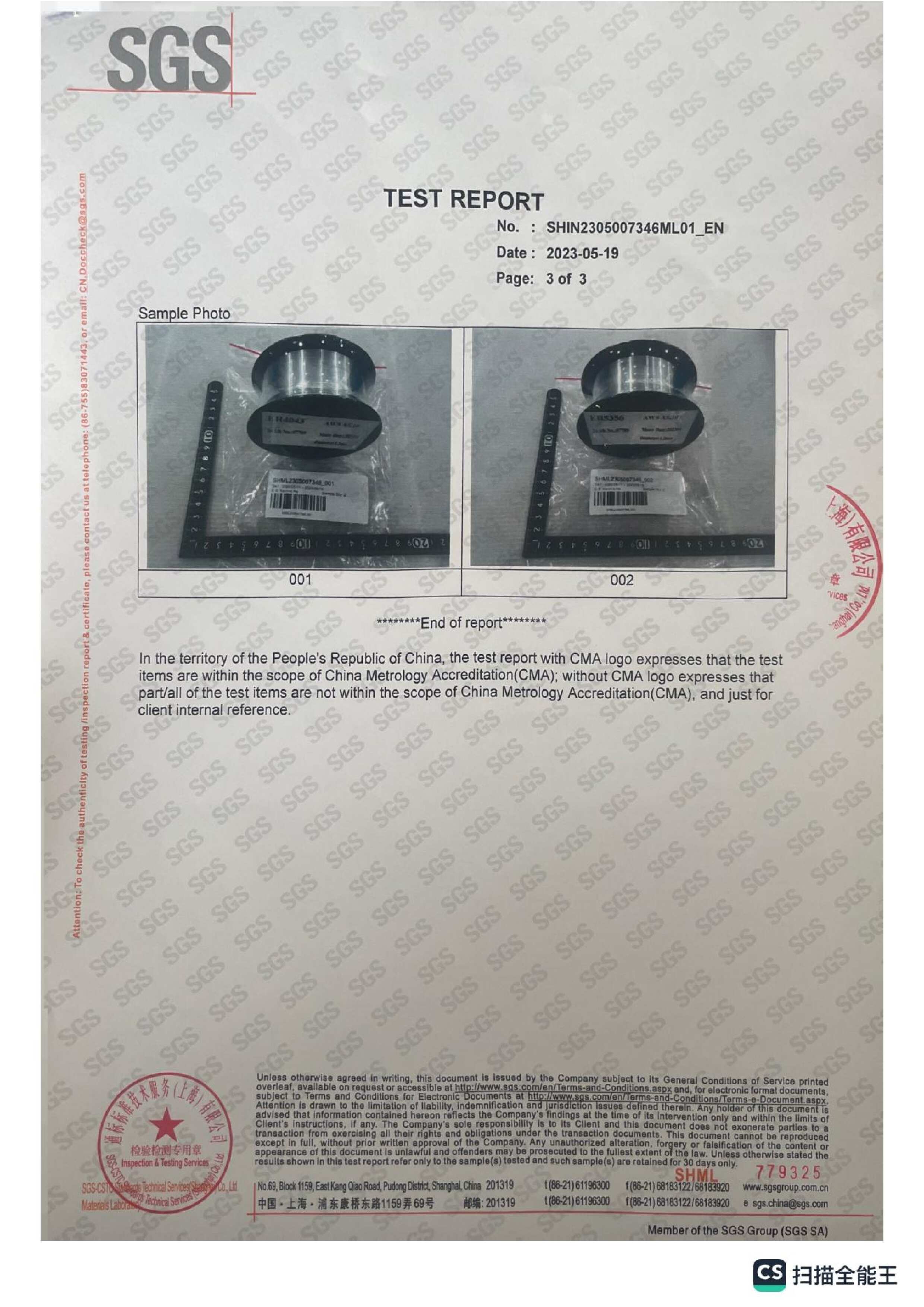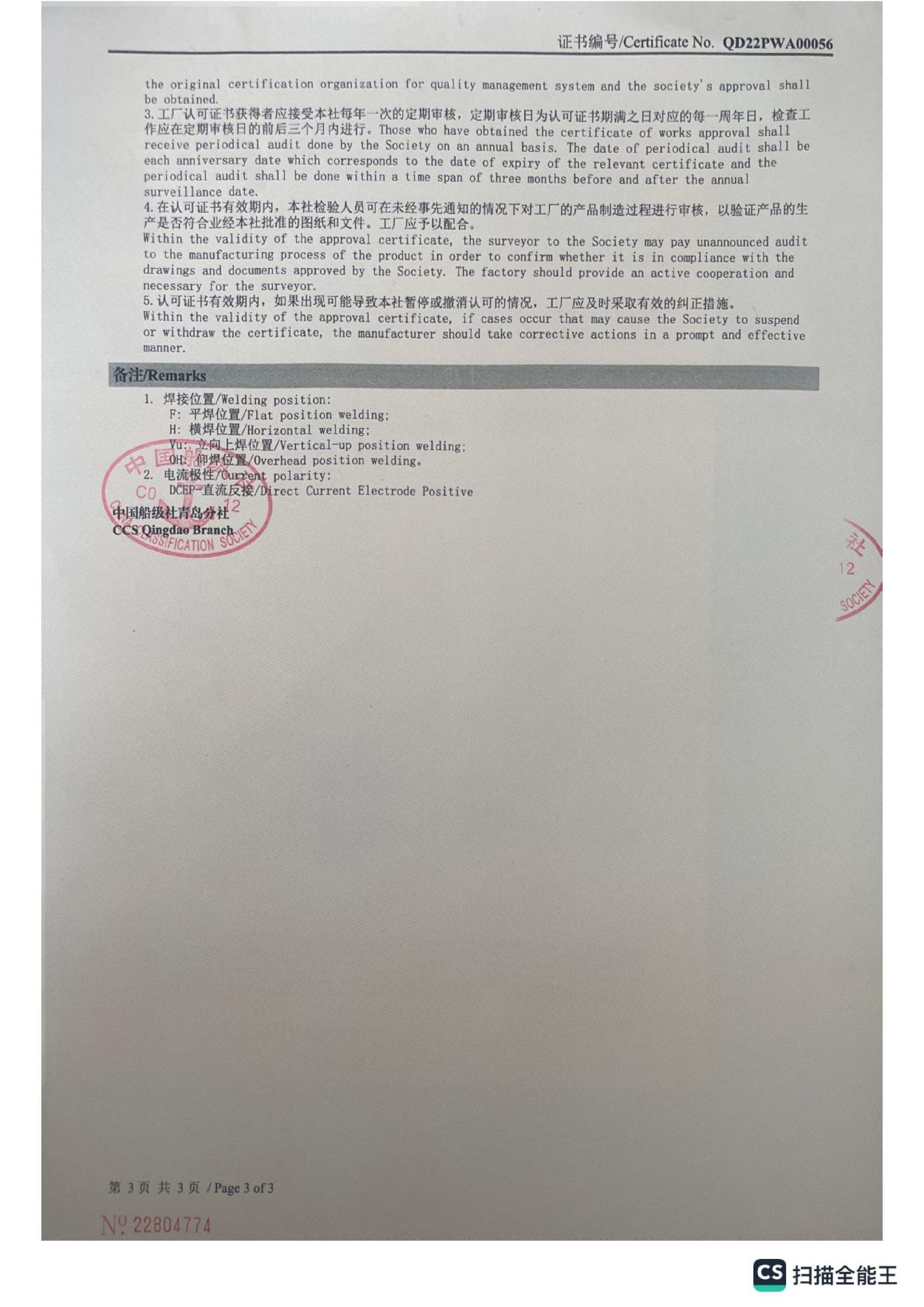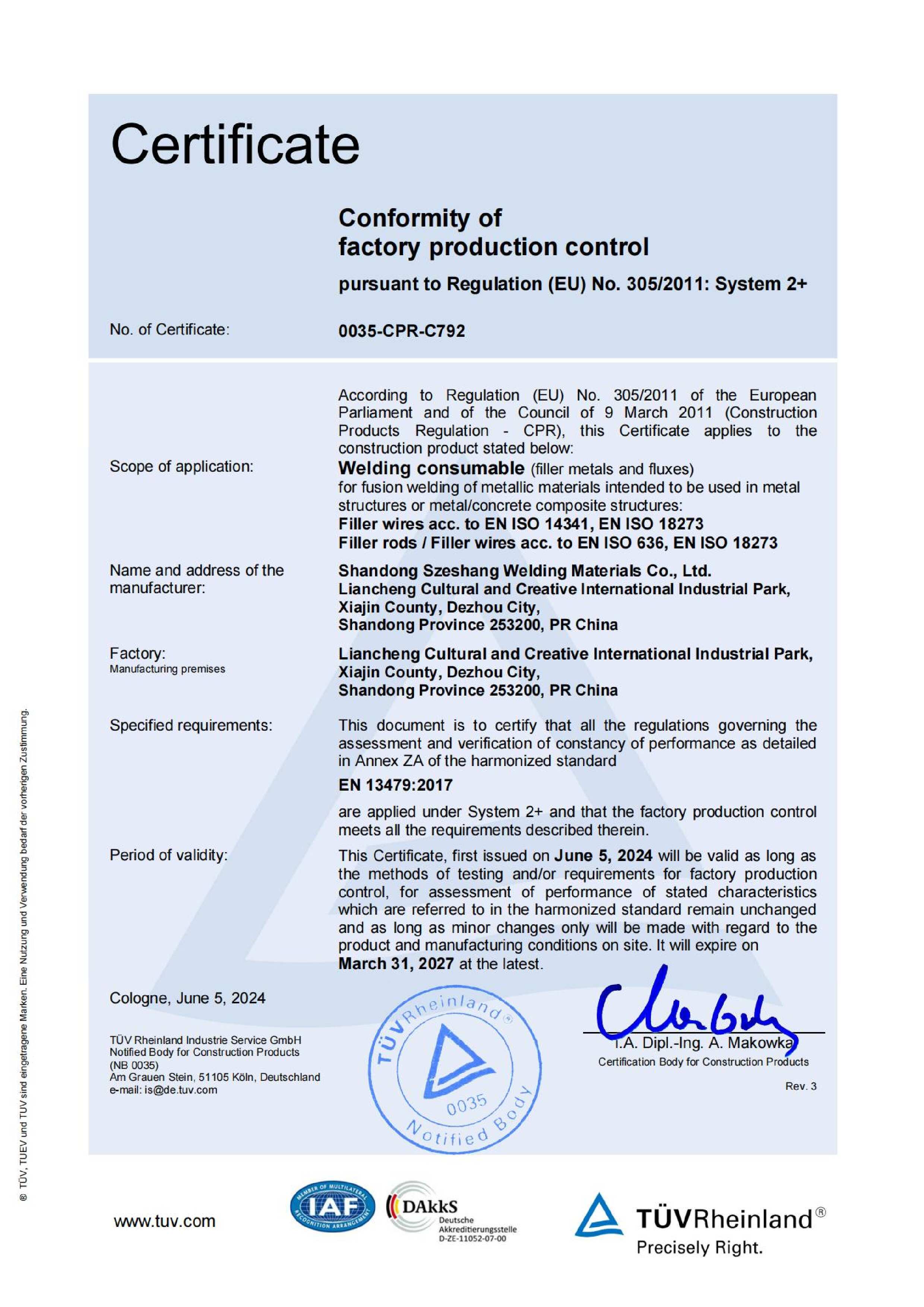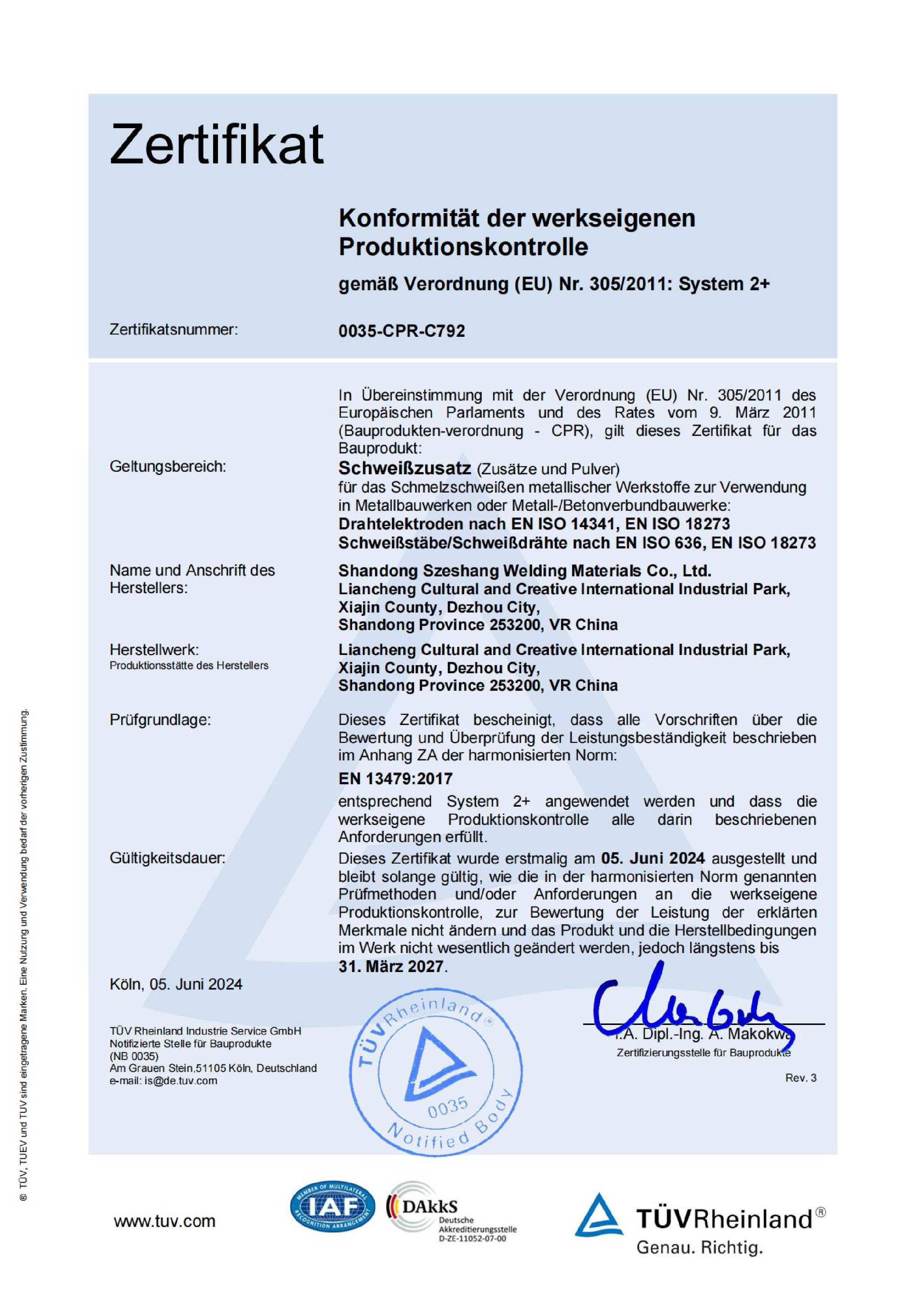 Certification for Szeshang Brand Welding wire and welding electrode
